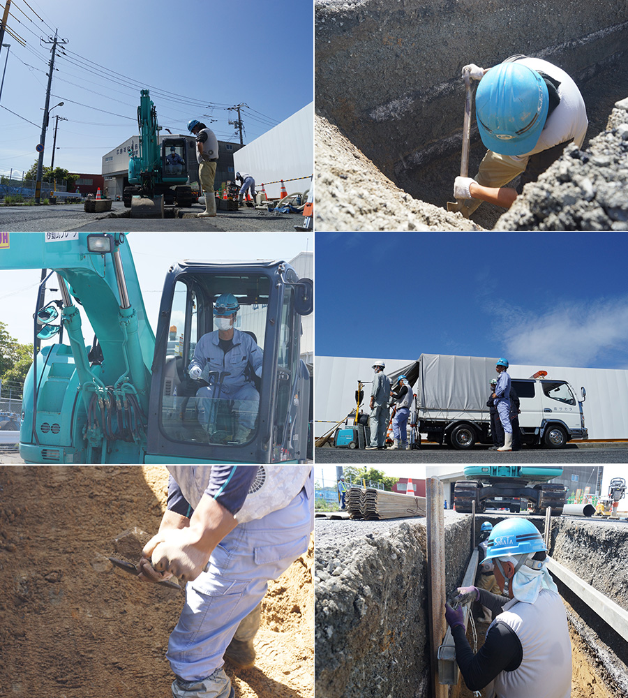 現場にて作業。建造物などの土台になる下準備作業や、配管管理や電設工事のための整備作業を行なっています
